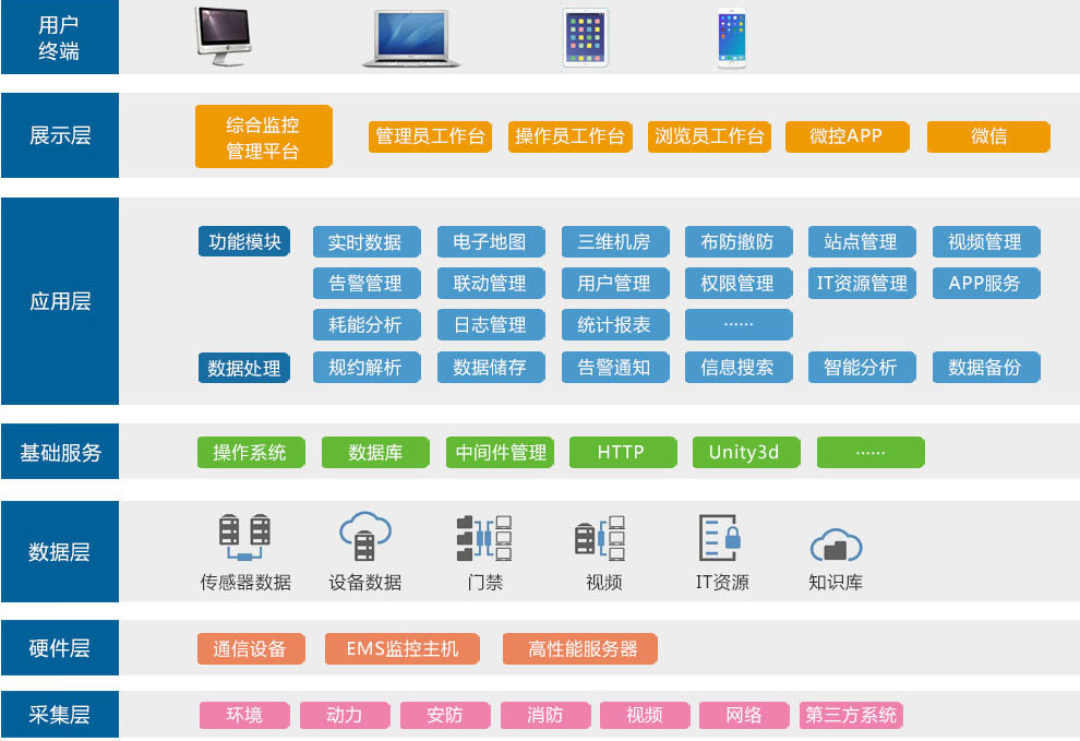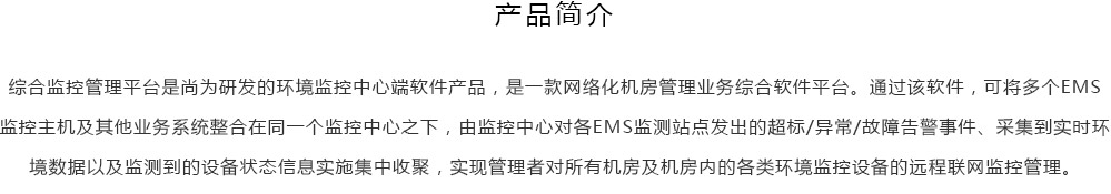 綜合監(jiān)控管理平臺(tái)是尚為研發(fā)的環(huán)境監(jiān)控中心端軟件產(chǎn)品,是一款網(wǎng)絡(luò)化機(jī)房管理業(yè)務(wù)綜合軟件平臺(tái)。通過該軟件,可將多個(gè)EMS監(jiān)控主機(jī)及其他業(yè)務(wù)系統(tǒng)整合在同一個(gè)監(jiān)控中心之下,由監(jiān)控中心對(duì)各EMS監(jiān)測(cè)站點(diǎn)發(fā)出的超標(biāo)/異常/故障告警事件、采集到實(shí)時(shí)環(huán)境數(shù)據(jù)以及監(jiān)測(cè)到的設(shè)備狀態(tài)信息實(shí)施集中收聚,實(shí)現(xiàn)管理者對(duì)所有機(jī)房及機(jī)房內(nèi)的各類環(huán)境監(jiān)控設(shè)備的遠(yuǎn)程聯(lián)網(wǎng)監(jiān)控管理。